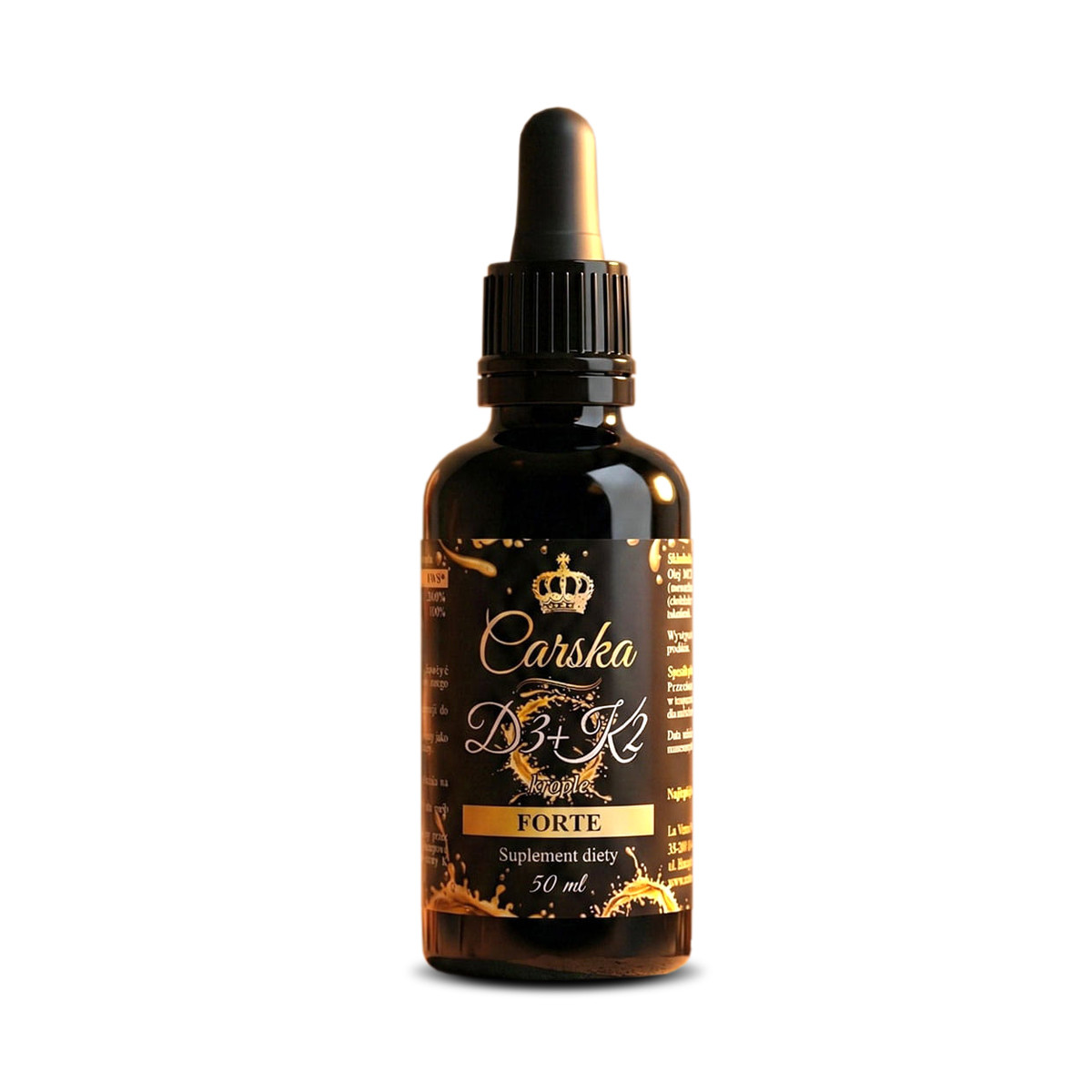 Carska witamina D3K2MK7 FORTE to najmocniejsza na polskim rynku zamknięta w jednej kropli zakraplacza potężna dawka „witaminy słońca” wzbogacona o naturalną witaminę K2MK7. Witaminy zawarte w wysoce przyswajalnym oleju MCT z kokosa, natychmiastowo uzupełniają braki, wspierając układ immunologiczny, chroniąc serce i budując gęstość układu kostnego.